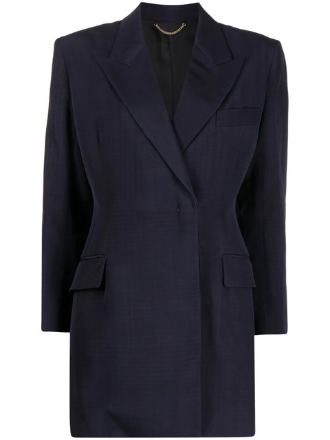 blue cotton blend peak lapels concealed front button fastening long sleeves chest welt pocket two front flap pockets thigh-length