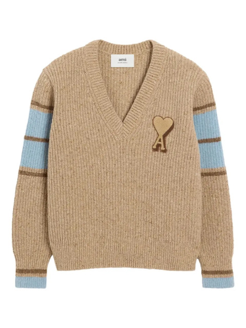 camel V-neck ribbed knit heart logo brown stripes light-blue stripes