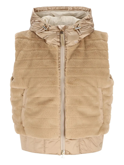 beige faux fur design high neck two side zip-fasteing pockets sleeveless classic hood