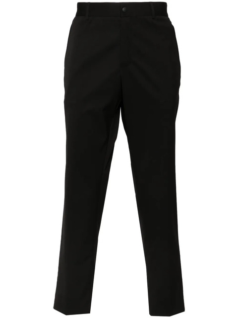 black twill weave belt loops waist tabs pressed crease two zip-fastening pockets two rear zip-fastening pockets straight leg front press-stud and zip fastening
