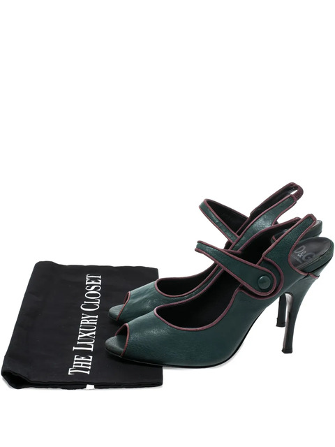 green leather peep toe slingback strap Mary Jane strap Condition: GOOD. This previously owned and used item is in good condition with minimal signs of use. This may include fading of material or plating and scratches.