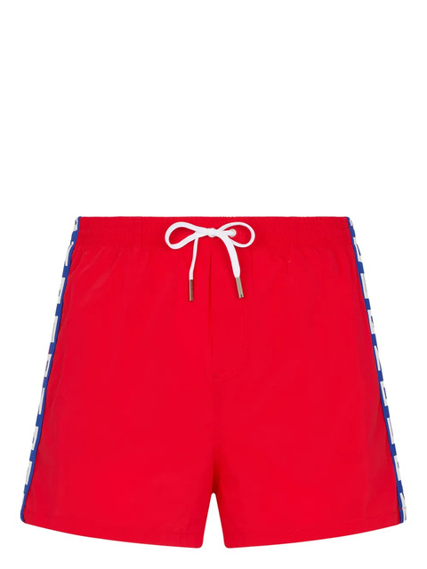 poppy red stretch-design logo-tape detailing elasticated drawstring waistband straight hem thigh-length Be mindful to try on swimwear over your own garments.