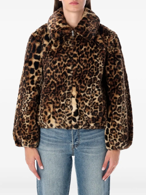 leopard artificial leather zip fastening collar long sleeves elasticated hem