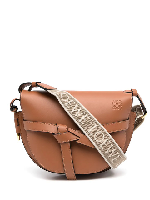 tan brown calfskin embossed detail logo shoulder strap knot detailing foldover top main compartment