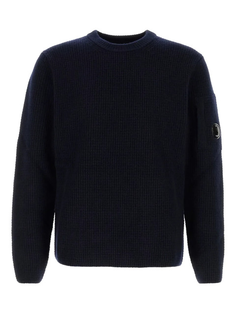 midnight blue wool blend chest pocket round neck long sleeves ribbed knit C.P. Company suggests removing any detachable accessories before washing.