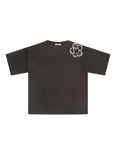 charcoal flower detail crystal embellishment round neck short sleeves cotton