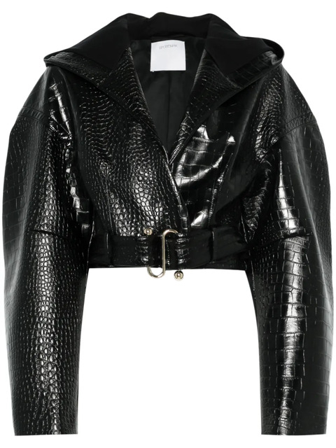 black double-breasted button fastening classic hood belt loops embossed crocodile effect