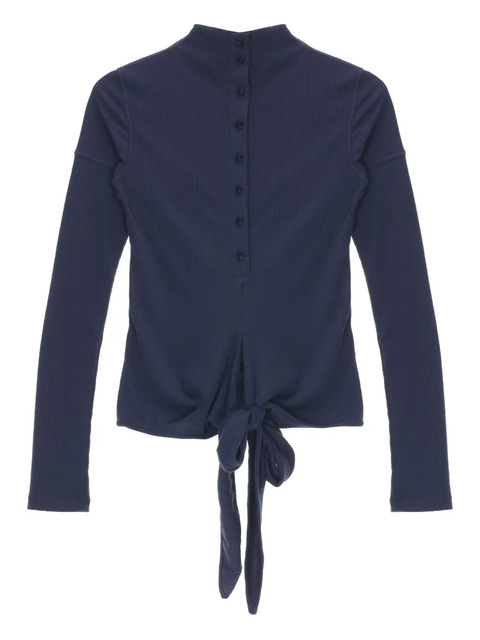 blue button fastening high neck long sleeves tie detail ribbed texture