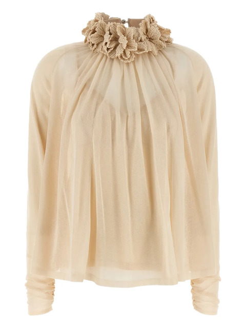 beige crochet detail semi-sheer long sleeves ruched cuffs high neck