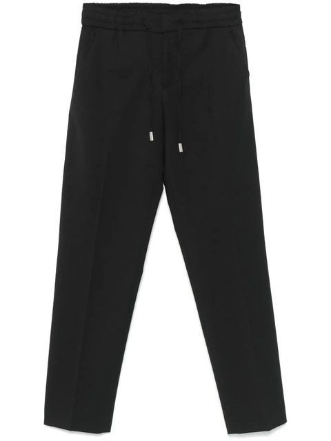 black interlock twill weave concealed front fastening mid-rise elasticated drawstring waistband pressed crease two side slit pockets two rear jetted pockets tapered leg