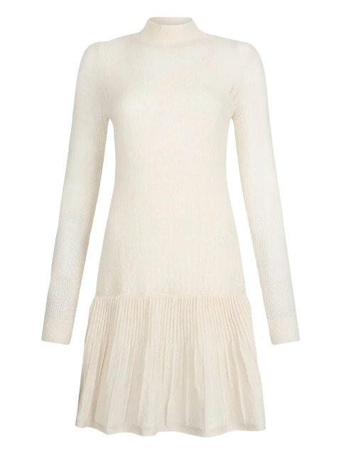 white wool blend knit lace stitch detailing high neck long sleeves ruffled hem metal logo on the back