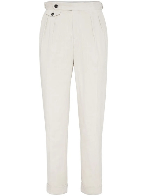 white cotton-cashmere blend corduroy concealed fly and button fastening side buckle fastening mid-rise pleat detailing front flap pocket two side inset pockets two rear button-fastening pockets turn-up hem tapered leg