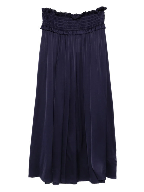 navy blue silk shirred waistband ruffled trim tonal stitching straight hem