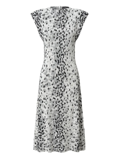 white, grey and black snow leopard pattern round neck rear zip fastening
