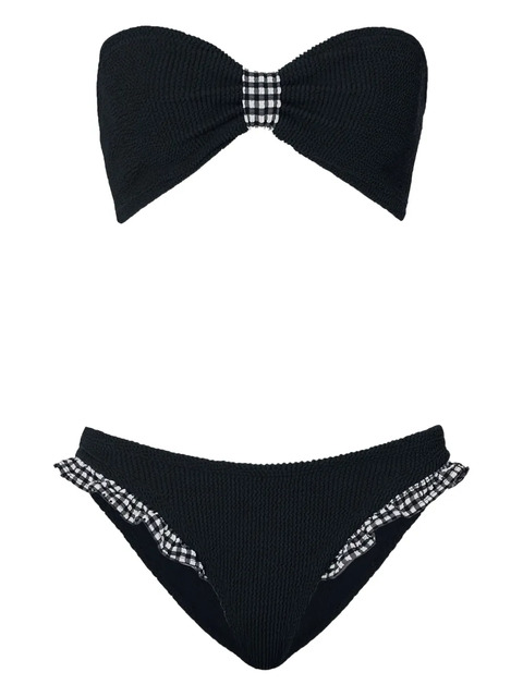 black gingham trim bandeau top ruffled bottoms textured fabric bow detail Be mindful to try on swimwear over your own garments.