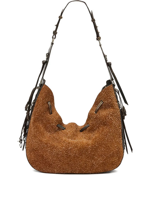 brown velvet texture adjustable shoulder strap fringe detailing detachable pouch detail drawstring fastening