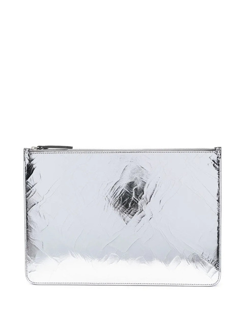 four-stitch logo clutch from Maison Margiela featuring silver-tone, calf leather, top zip fastening, internal logo patch, main compartment, signature four-stitch logo and metallic finish.