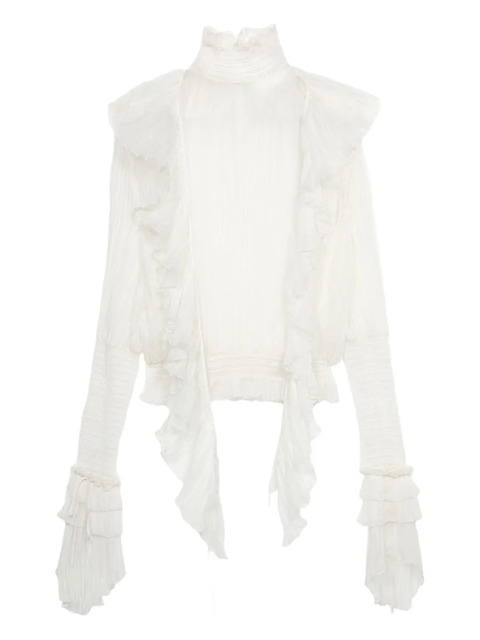 off-white pleated texture high neck ruffle detail long sleeves smocked cuffs