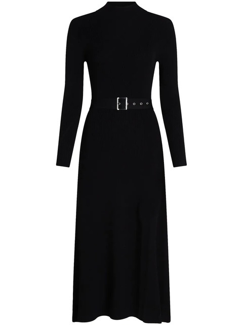 black ribbed knit mock neck belted waist long sleeves side slit mid-calf length straight hem