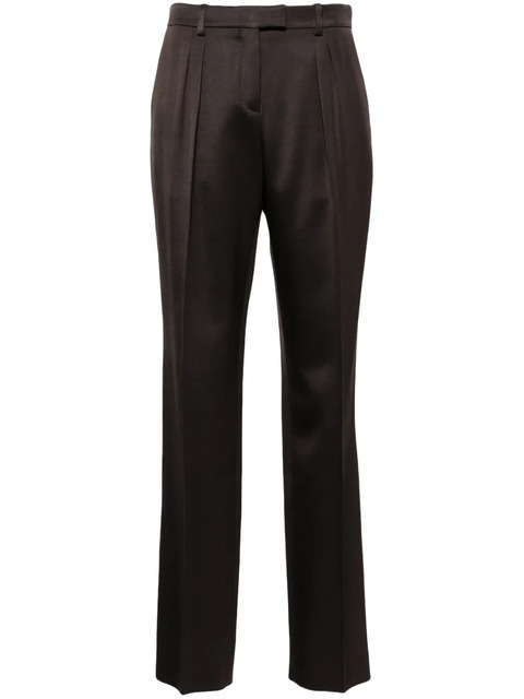 dark cedar brown silk virgin-wool blend twill weave tailored design belt loops two side slash pockets front pleat detailing pressed crease full-length two rear button-fastening jetted pockets concealed front button, hook and zip fastening