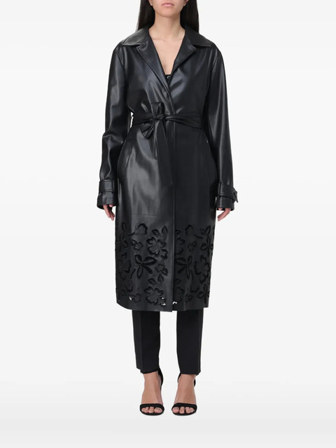 black floral appliqué belt lapel collar long sleeves buttoned cuffs