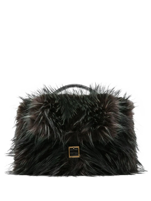 green faux fur single top handle foldover top with buckle fastening internal zip-fastening pocket
