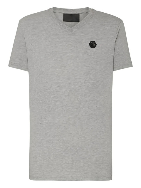 grey cotton V-neck logo patch short sleeves