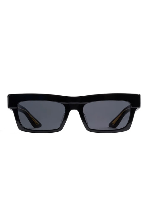 black rectangle frame tinted lenses nose pads straight temples These glasses come with a protective case.