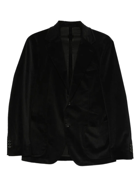 black cotton blend notched lapels front button fastening side patch pockets buttoned cuffs