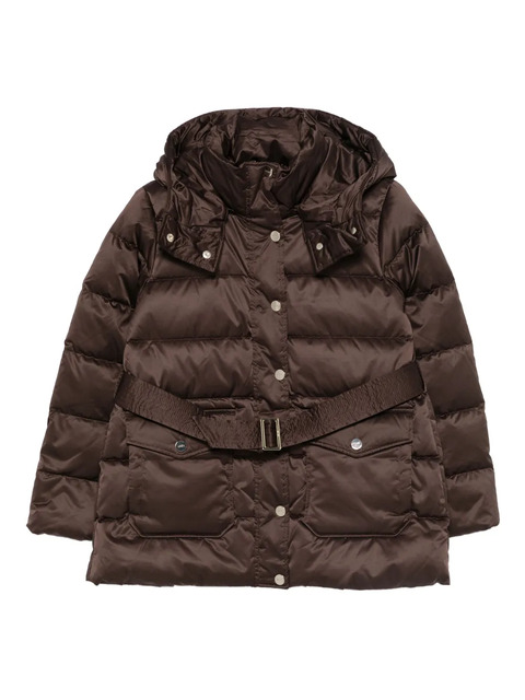 brown quilted design button fastening belted waist detachable hood front flap pockets