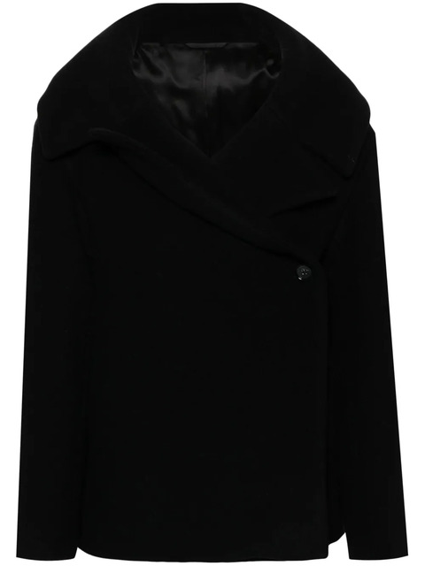 black wool blend felted wrap design wide notch lapels off-centre front button fastening long sleeves slip pockets to the sides straight hem satin lining