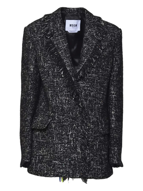 black fringed trim notched lapels front button fastening front flap pocket long sleeves