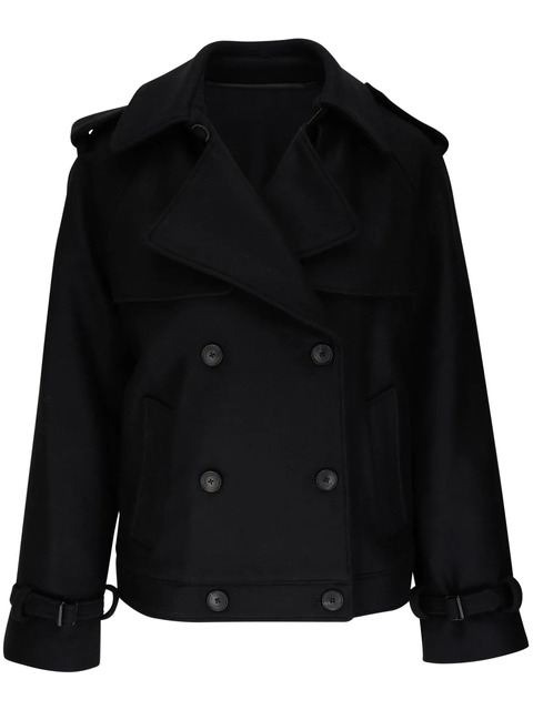 black virgin wool blend notched lapels epaulettes long sleeves belted cuffs double-breasted button fastening