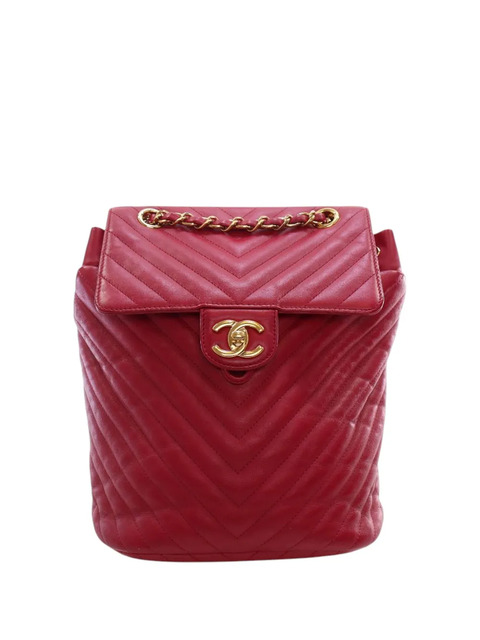 quilted calf leather body leather-woven chain handle adjustable flat back straps top flap with interlocking CC twist lock closure drawstring closure exterior back slip pocket interior zip and slip pockets red This item has no inclusions. Condition: GOOD. This previously owned and used item is in good condition with minimal signs of use. This may include fading of material or plating and scratches. Due to the exclusivity of this item and its limited availability, processing and delivery might take longer than usual. Declared Damages: Front Feature(s) Moderate Creases. Exterior Side Feature(s) Moderate Creases. Exterior Back Feature(s) Moderate Creases. Please refer to the photos on this product page for a detailed view of the item, including any damages declared.