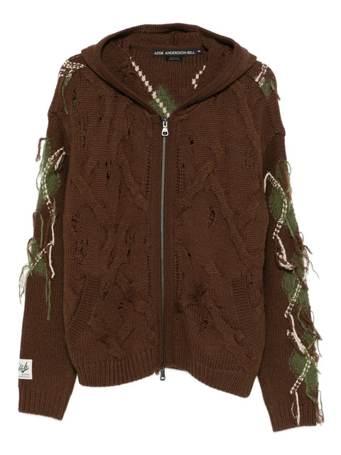 brown cable knit fringed detailing on sleeves classic hood front zip fastening