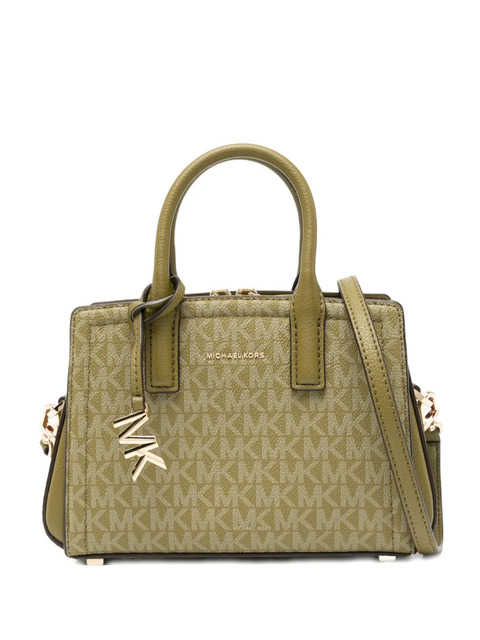 khaki green concealed magnetic fastening two top handles adjustable detachable shoulder strap gold-tone logo lettering