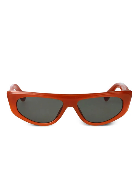orange logo lettering tinted lenses These glasses come with a protective case.
