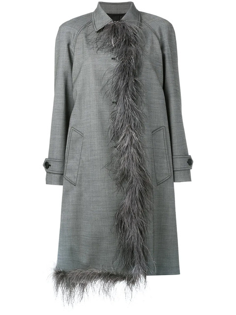 Grey silk and wool blend fur trim coat from Prada.