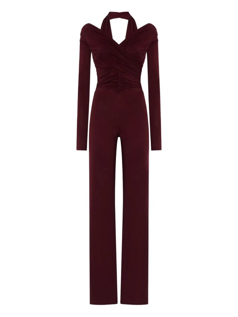 bordeaux halterneck long sleeves draped detailing gathered detailing wide leg
