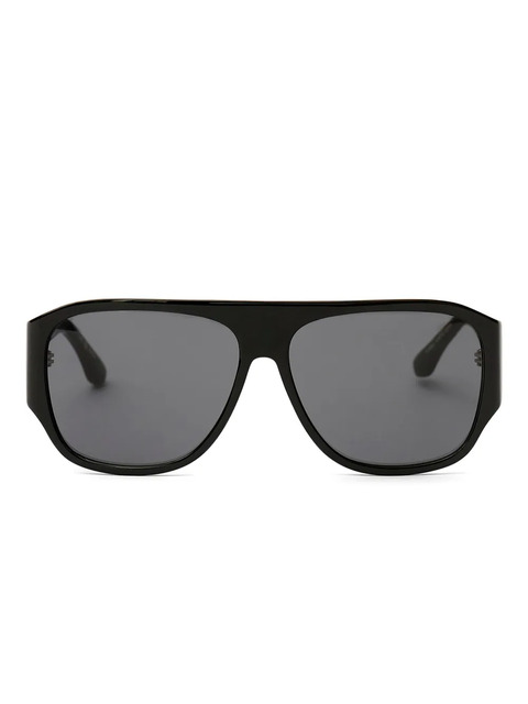 black square frame grey lenses subtle branding smooth finish plastic construction These glasses come with a protective case.