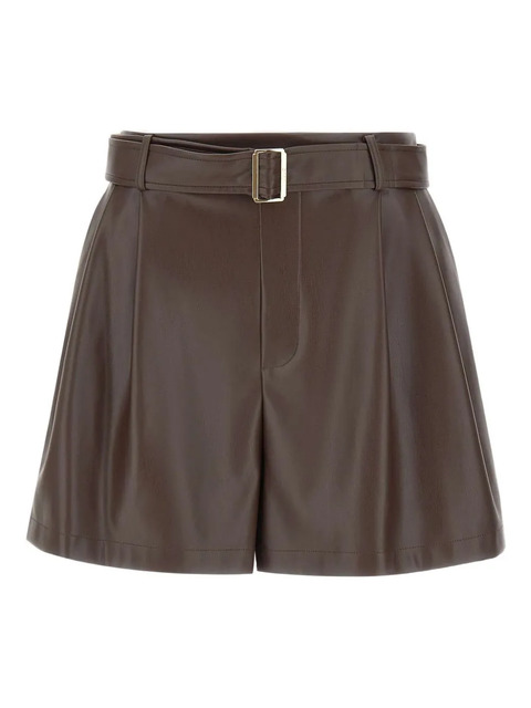chocolate leather effect elasticated waist belt gold-tone buckle side welt pockets double front pleats