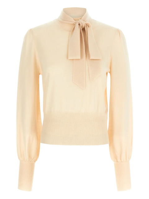 beige high neck pussybow collar long puff sleeves ribbed cuffs