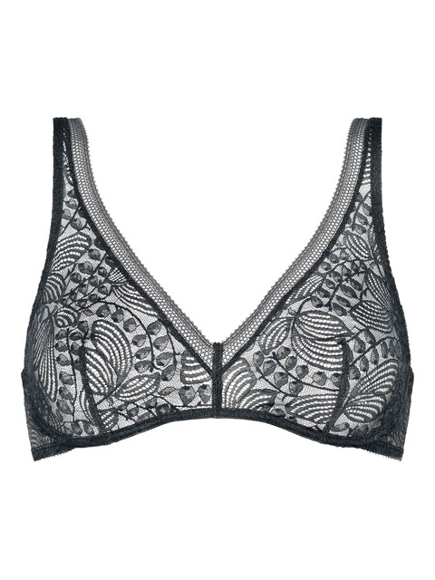 black triangle shape floral lace underwire support V-neckline adjustable straps bust darts