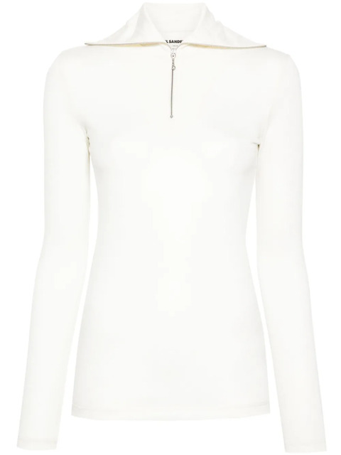 cream white jersey texture logo print at the neckline seam detailing long sleeves straight hem short front zip fastening