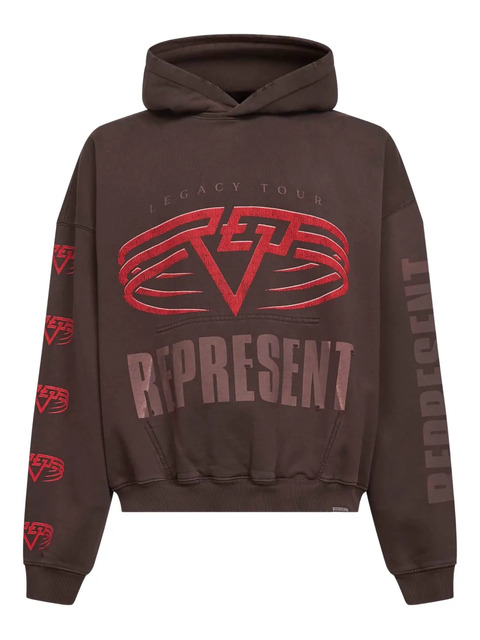 brown contrasting print front and back print kangaroo pocket metal logo bar hem ribbed cuffs and bottom band