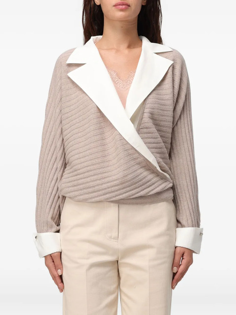 beige ribbed knit wrap design long sleeves buttoned cuffs