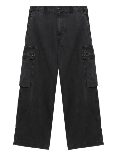 black cotton button fastening belt loops side cargo pockets rear flap pockets