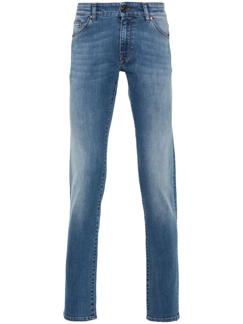 medium blue stretch-cotton washed denim whiskering effect contrast stitching mid-rise belt loops classic five pockets logo patch to the rear slim cut concealed fly and button fastening