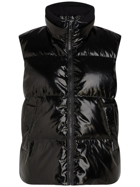 black recycled polyamide high-shine finish padded design funnel neck drawstring neck front zip fastening sleeveless two side welt pockets straight hem