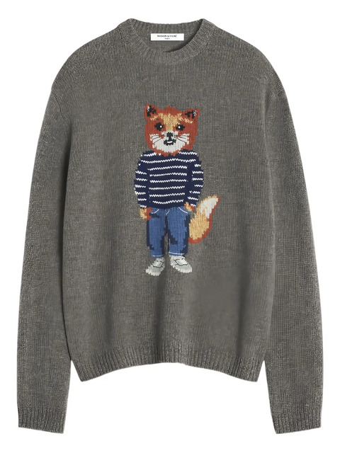 metallic and grey intarsia knitting fox motif round neck long sleeves ribbed hem